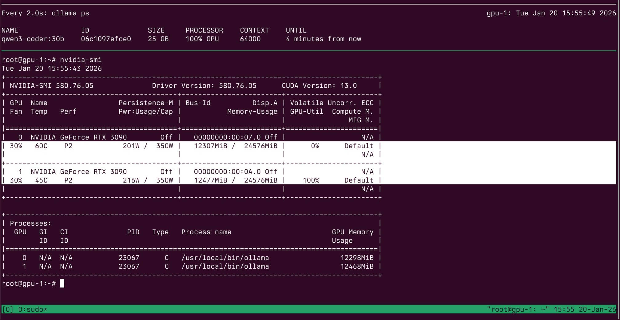 I then ran ollama pull qwen3-coder:30b which seemed to fit fine taking up about half of each of the 3090's 24GB of VRAM.